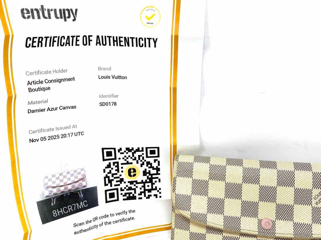 2018 Emilie Wallet; Damier Azur; SD0178; Entrupy; Box; *scuffed; odor*