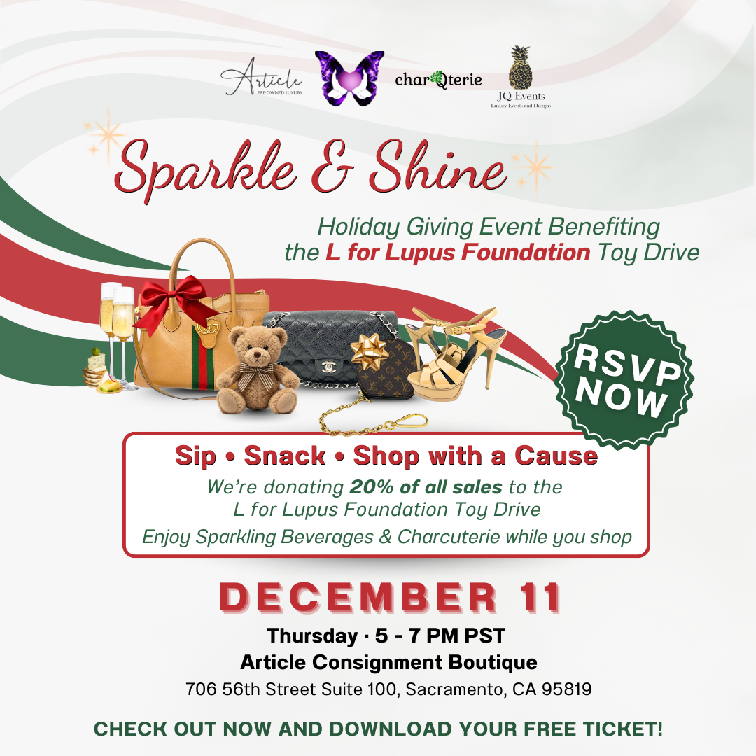 Step into an evening of luxury, celebration, and purpose! Join us on Thursday, December 11, for our “Sparkle and Shine” event, supporting the L for Lupus Foundation Toy Drive. Your exclusive invitation to shop, sip, and give back in true luxe fashion awaits!