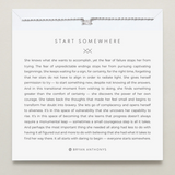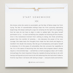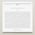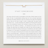 She knows what she wants to accomplish, yet the fear of failure stops her from trying. The fear of unpredictable endings stops her from pursuing captivating beginnings. She keeps waiting for a sign, for certainty, for the right time, forgetting that her stars do not have to align in order to radiate light. She gives herself permission to try — to start something new, despite not knowing all the answers. And in this transitional moment from wishing to doing, she finds something greater than the comfort of certainty — she discovers the power of her own courage. She takes back the thoughts that made her feel small and begins to transform her doubt into bravery. She lets go of complacent and opens herself to aliveness. It’s in this space of vulnerability that she uncovers her capability to rise. It’s in this space of becoming that she learns that progress doesn’t always require a monumental leap — sometimes a small courageous step is all it takes. And perhaps the most important thing she needed all along had less to do with having it all figured out and more to do with believing that she had what it takes to find her way there. It all starts with daring to begin — everyone starts somewhere.